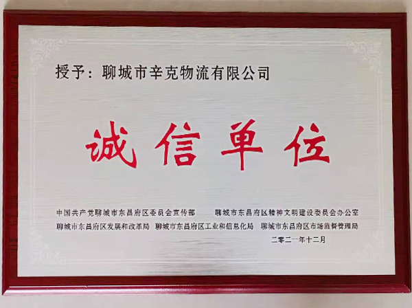 聊城辛克物流公司,获得2021年“诚信企业”称号;