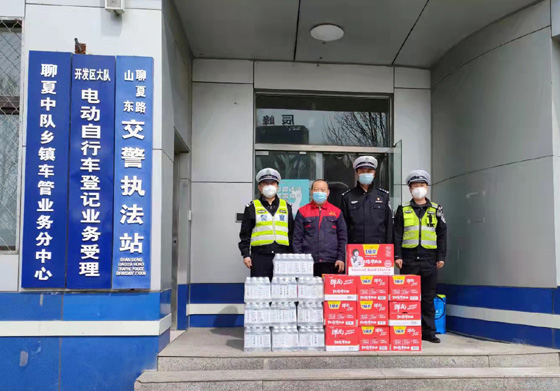 疫情期间,聊城市辛克物流有限公司法人田维财向开发区聊夏中队捐赠物资,和开发区李大队长,聊夏中队王队长合影!