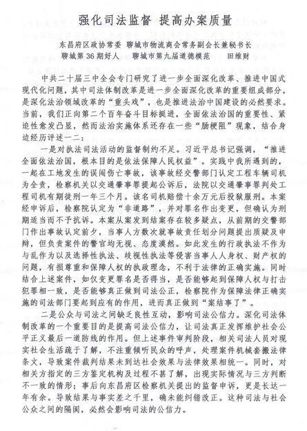 聊城辛克物流总经理,田维财,关于“强化司法监督,提高报案质量”,的政协提案
